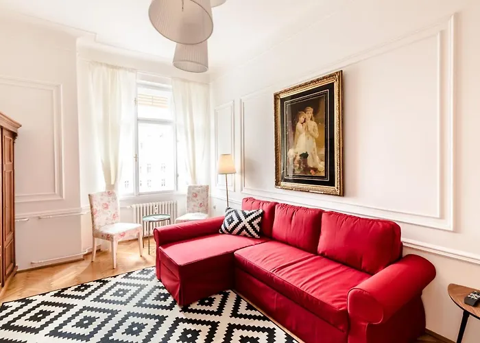 Golden Esthetic With Red Sofa Apartment Boedapest van 66 m² biedt snelle toegang tot verschillende stadsoriëntatiepunten, zoals Szimpla Kert, gelegen op op loopafstand van ongeveer 6 minuten ervandaan.